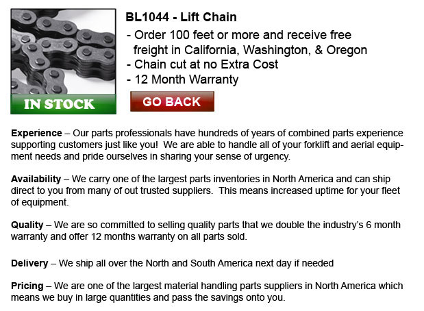 TOLL FREE: 1-888-633-0283 www.forkliftchain.ca Email Us Lift Parts Express prides itself on the diversity and volume of parts we carry. Regardless of the model of lift truck you run, we have the parts you need. The cost savings we can offer will... About Us | ||